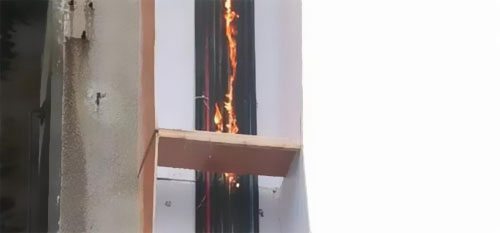 5分40秒,第四層電井電纜悉數(shù)燒起來(lái),由于煙囪效應(yīng)的原因,三層電井構(gòu)成的熱空氣由于密度較低,在電纜井內(nèi)得以往上活動(dòng),使高熱氣體不斷地在底部集合,使火勢(shì)更快的向上焚燒,不到10秒鐘的時(shí)刻第五層電井燃起大火。